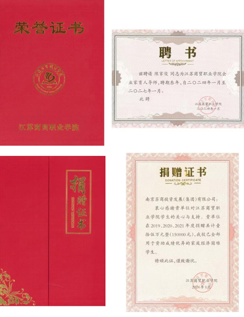 ↑馮志明書記(左)為陳家俊董事長頒發榮譽證書和“蘇商獎學金”捐贈證書