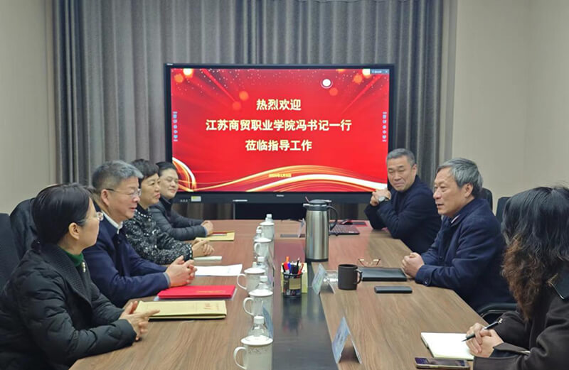 2024年1月8日下午,江蘇商貿職業學院黨委書記馮志明先生一行四人專程來到蘇商集團本部指導交流工作,集團董事長陳家俊先生熱情接待了馮書記一行。
